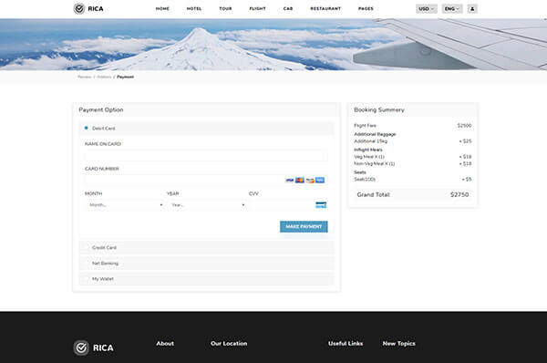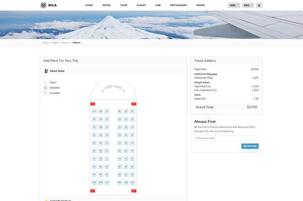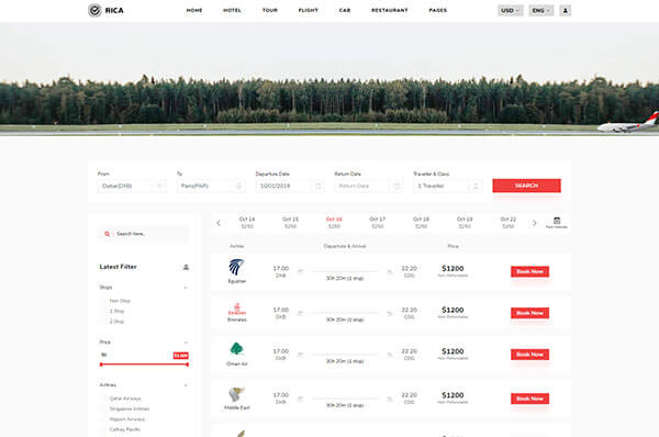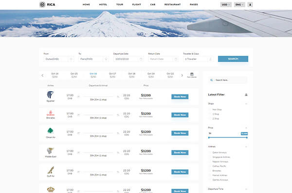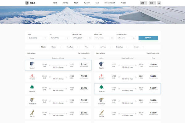Rica has all the required pages of flight booking. there are 3 demos, 5 listing pages which also include round trip and 5 other pages.
