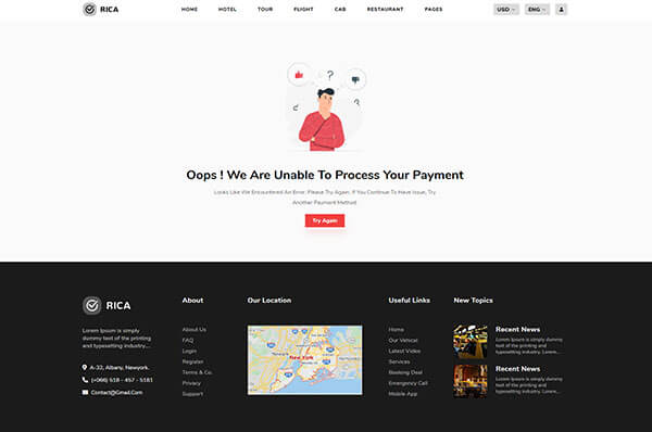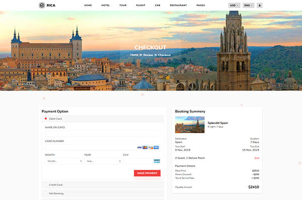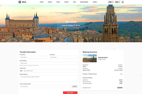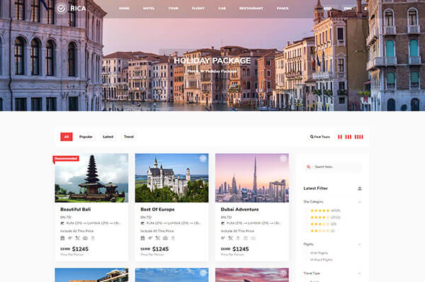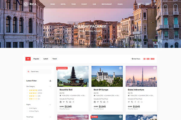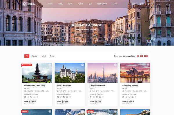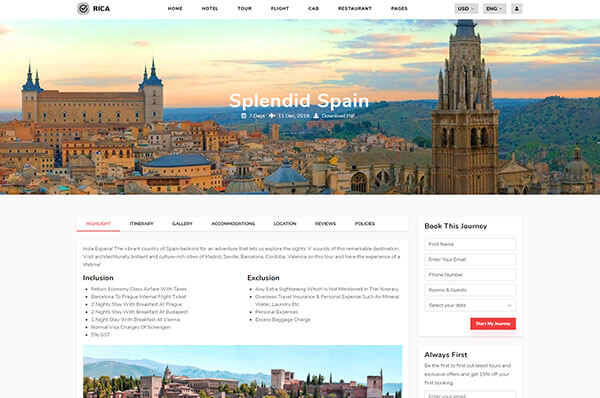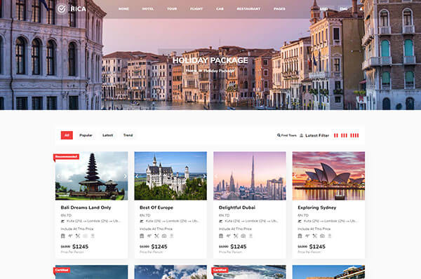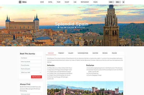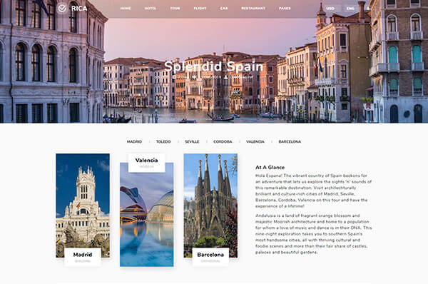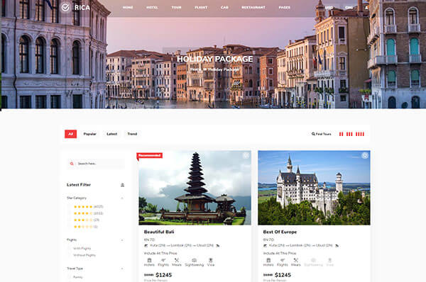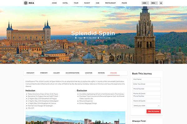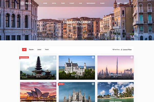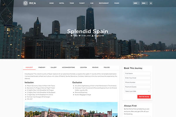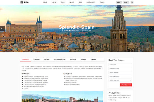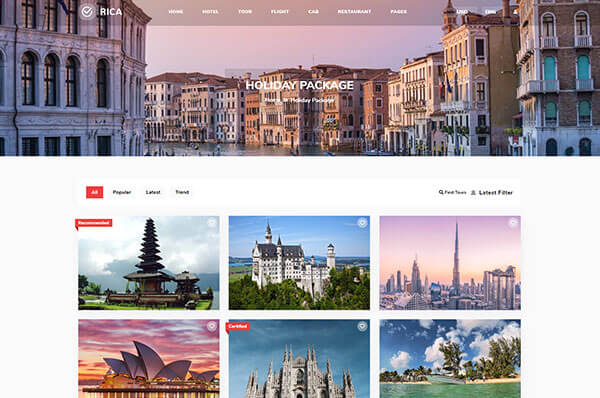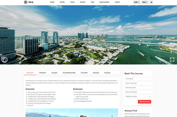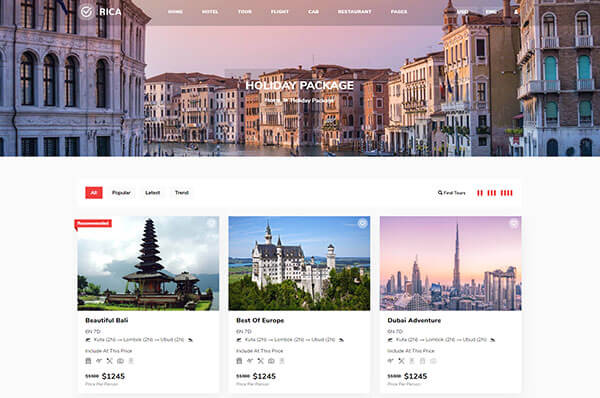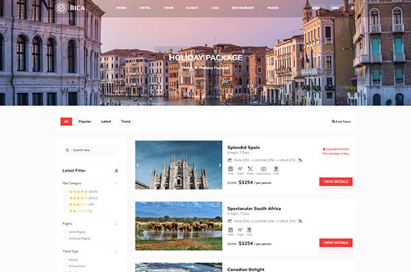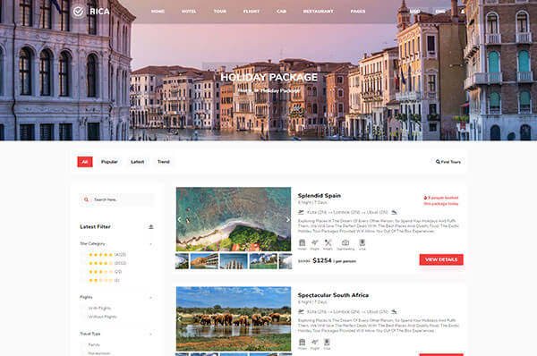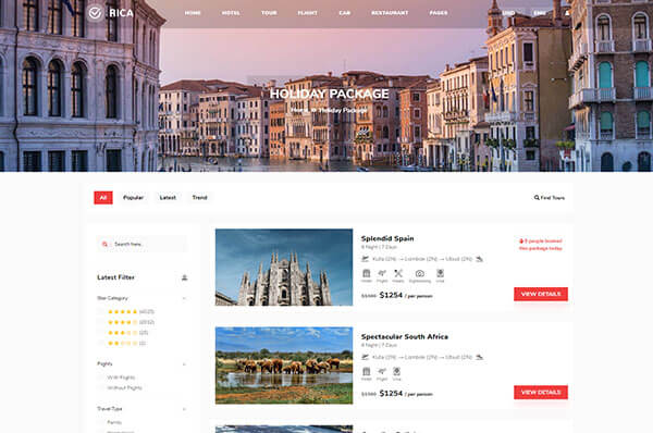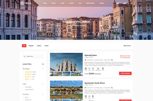 Rica has all the required pages of tour booking which include 3 demos, 30+ listing pages with the map integration, 8+ single detail pages and 4 other pages.